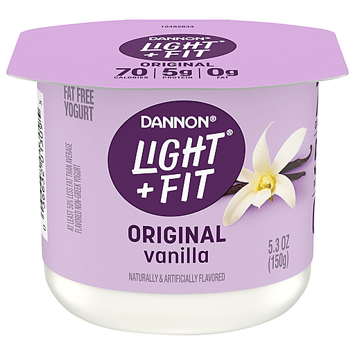 Looking for a delicious nonfat yogurt with creamy vanilla flavor? Give your taste buds a reason to rejoice with a Dannon Light + Fit Vanilla Original Nonfat Yogurt Cup. Every bite of this vanilla flavored yogurt makes it easy to love nonfat snacks with this delicious light yogurt brand.* At Light + Fit, we serve balanced snacks packed full of delightfully creamy yogurt so you can be your best self. Our nonfat yogurt comes in a cup so you can enjoy a serving anytime as a snack at work or as a late-night snack. With 70 calories and 5g of protein per serving, it’s a delicious, convenient option. Enjoy it as a simple snack or add a cup to your breakfast parfaits and yogurt smoothies. Or, use some in your favorite recipes as a flavorful substitute for baking ingredients. Add some joy to your day, every day, with Light + Fit Vanilla Original Nonfat Yogurt. *At least 50% less fat than average flavored non-Greek yogurt; Light + Fit: 50-60 calories, 0g fat; Average flavored non-Greek yogurt: 100 calories, 2g fat per 4 oz.