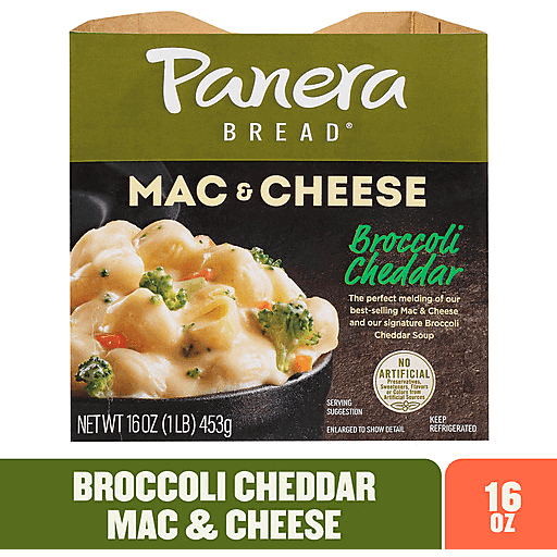 Panera Broccoli Cheddar Mac & Cheese combines two of Panera’s signature menu items for a bakery-cafe inspired microwave meal that you can enjoy at home or on-the-go. Panera Mac and Cheese meets the cafe's ever-popular Broccoli Cheddar Soup to create a creamy blend of white cheddar cheese enveloping tender shells, broccoli florets and shredded carrots. This vegetarian snack is made with no artificial preservatives, sweeteners, flavors or colors from artificial sources. Whether you need an easy dinner or a quick lunch on the go, this Panera packaged meal is perfect for any time of day. To cook this single serve prepared meal, remove the lid and film and place in the microwave, covering loosely. Heat this microwavable mac and cheese on high for 3 to 4 minutes and stir halfway through. You can also cook this mac and cheese on the stove top to 165 degrees F, but do not boil. Store these lunch snacks in the refrigerator or freezer. Make easy, craveable meals with help from Panera Bread at home.