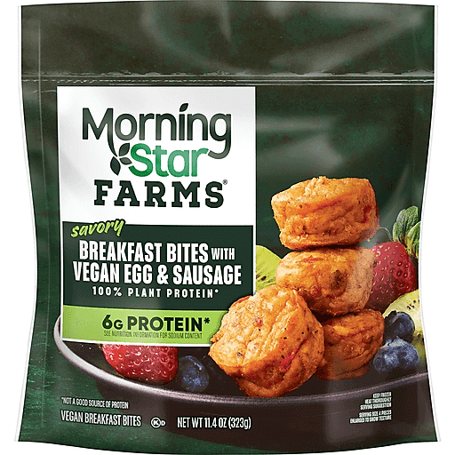 Grab an eggscellent bite to start your day with MorningStar Farms Breakfast Bites with Vegan Egg and Sausage. Each bite is filled with cheddar-style cheeze, onion, red bell peppers, vegan eggs, and meatless sausage. It's a perfect way to start your day with 100% plant protein that tastes simply delicious. They're easy to heat and go anywhere. Simply pop in the oven, air fryer, or microwave for a quick bite while you head out the door; With 54% less fat than the leading sausage egg bites*, you can enjoy a delicious breakfast side, afternoon snack, or an easy breakfast starter for dinner. Enjoy these bites in the office, after your workout, or on the go. Whenever you're craving a flavorful breakfast bite on the go, MorningStar Farms 100% plant based breakfast bites are sure to please vegans, vegetarians, and meat lovers alike. *The leading sausage egg bites contain 25g total fat per serving (130g). MorningStar Farms Breakfast Bites with Vegan Egg and Sausage contain 7g total fat per serving (76g).