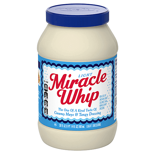 Miracle Whip Light Mayo-like Dressing adds a cool, zesty flavor to almost anything. Bursting with tangy vinegar and a medley of spices, our family favorite dressing and condiment delivers creamy texture and delicious flavor in every bite. As a spread similar-tasting to mayonnaise, light Miracle Whip is known for kicking sandwiches up a notch. Try out this versatile ingredient that can be used to make tangy salad dressings and even chocolate cakes for a finger-licking adventure. Our Light Miracle Whip contains fewer calories and fat than Kraft Mayonnaise. This product contains 20 calories and 1.5g fat per serving, Kraft Mayonnaise contains 90 calories and 10g fat per serving. Try light Miracle Whip for sandwiches and salads, in your favorite chicken recipe or as a creamy burger sauce. It also makes a tasty secret ingredient in deviled eggs and potato salad. Each jar should be stored in the refrigerator after opening.
